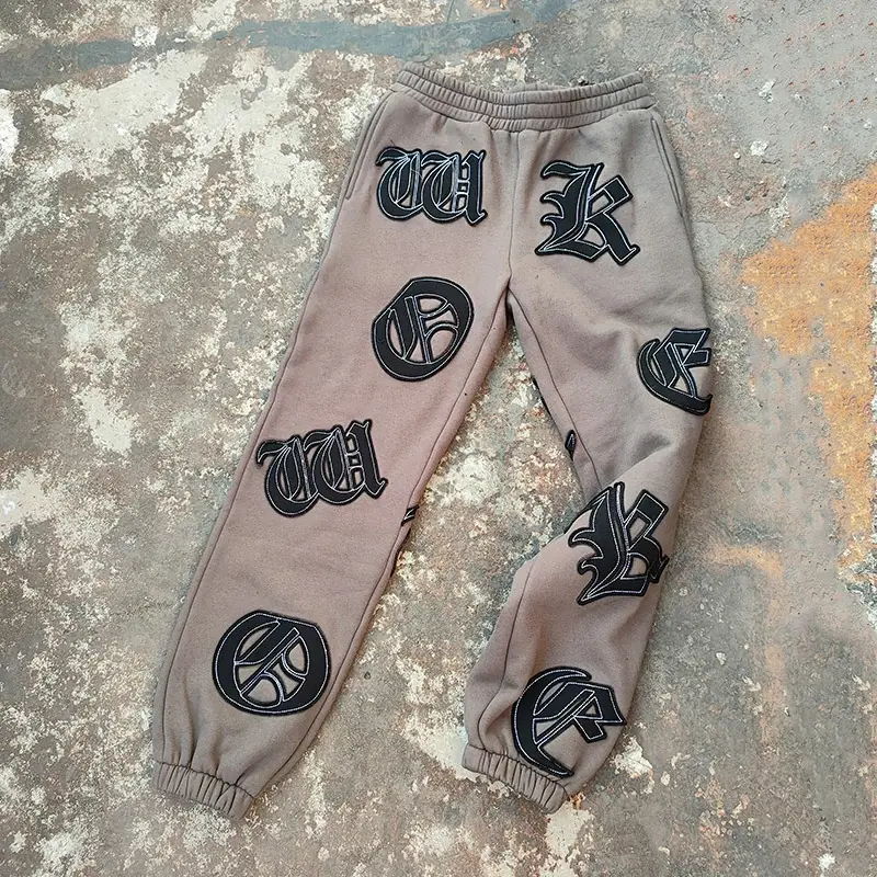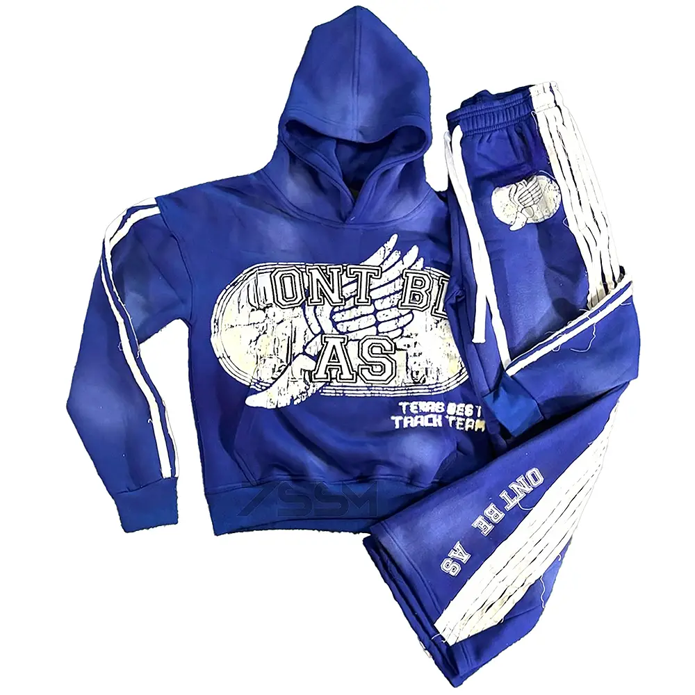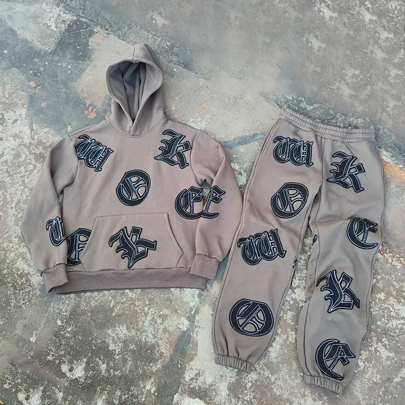 Custom Design Stacked Tracksuit Set 2 Piece Jogging Ripped Embroidery Patch Distressed Rhinestone Hoodie and Sweatpants Suit