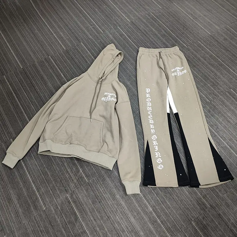 Custom Men's Track Suits Heavyweight Fleece Cotton French Terry Oversized Winter Rhinestone Hoodie and Flared Sweatpants Sets