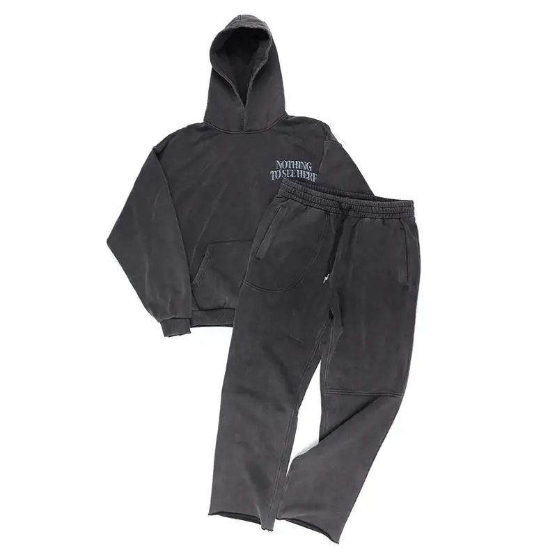 Custom Men Hoodies and Sweat Pants Set Acid Wash Tech Fleece Tracksuit Distressed Embroidery Flared Sweatpants and Hoodie Set