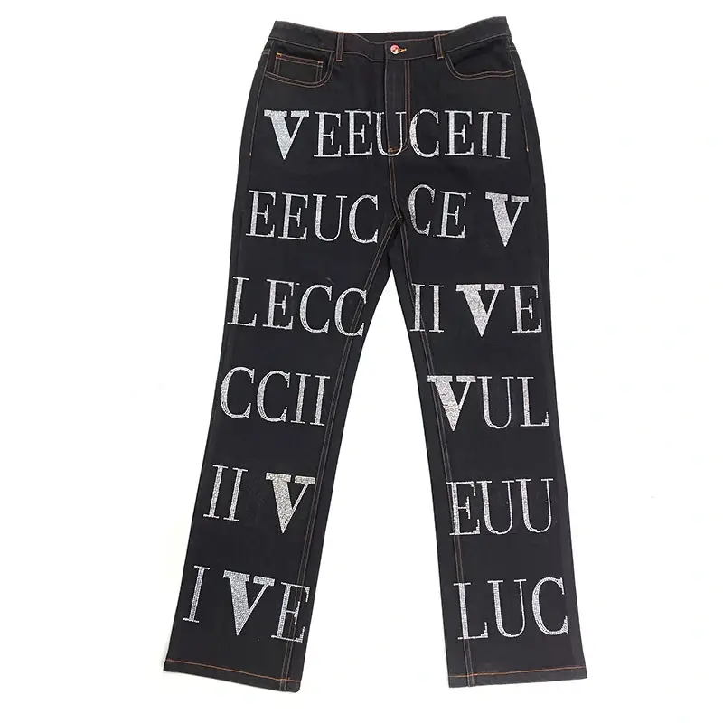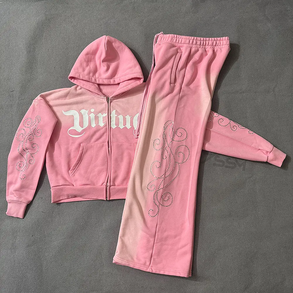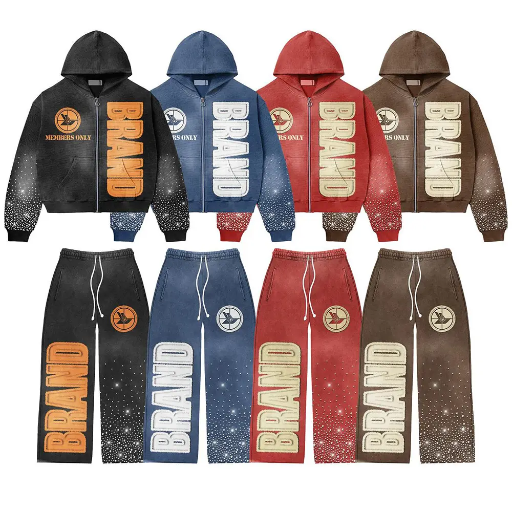 Street Style Two Piece Set Custom Print Rhinestones Jogging Faded Flared Tracksuit Stacking Sweatpants and Zip up Hoodie for Men