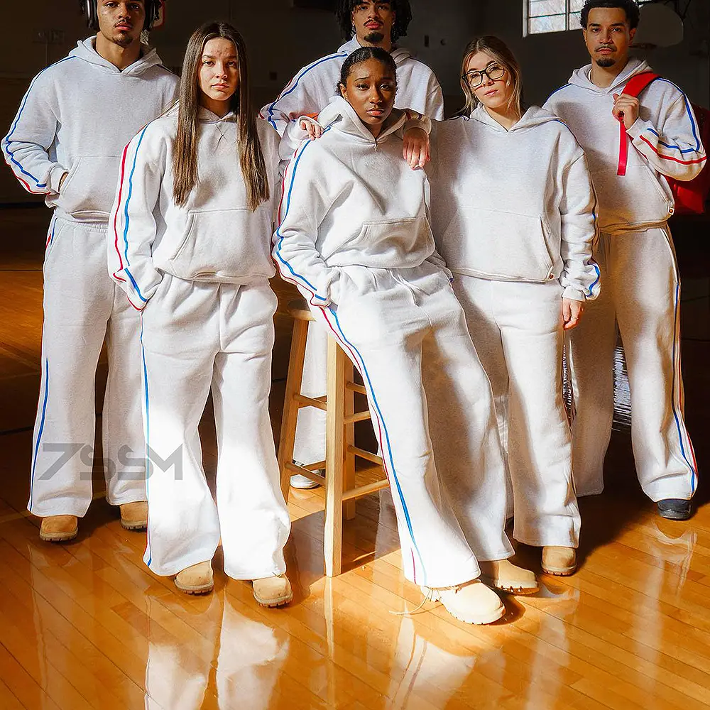 Custom Unisex Heavyweight French Terry Fleece Two-Piece Tracksuit Streetwear Casual Baggy Side Stripes Sweatpants and Hoodie Set
