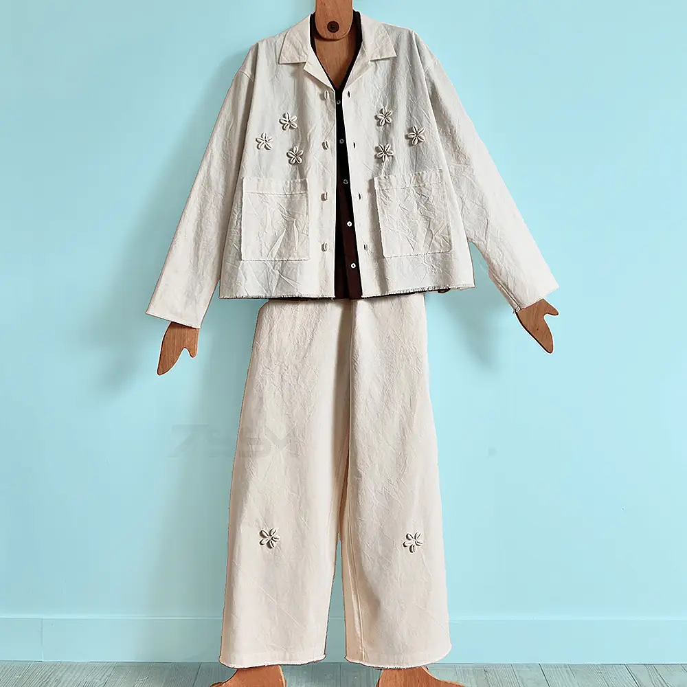 Custom Premium Linen Unisex 2 Pieces Suits Shell Decorated Long Sleeve Solid Color Linen Shirt and Wide Leg Casual Pants Set Men