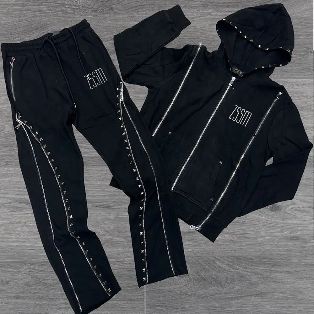 Custom Man Jogge Sweatsuit Rhinestone Rivet Tracksuit Detachable Sleeve Zip up Hoodie and Zip Flare Sweatpants Set Tracksuit