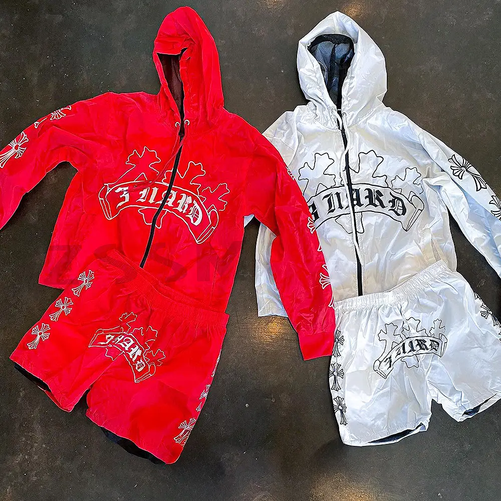 Custom Two Piece Splice Short Jacket Set Zip up Jacket Sweatsuit and Nylon Sweat Pants Shorts Tracksuit for Men