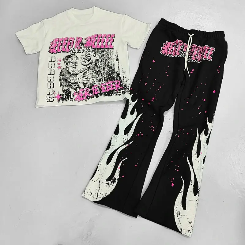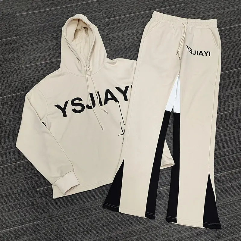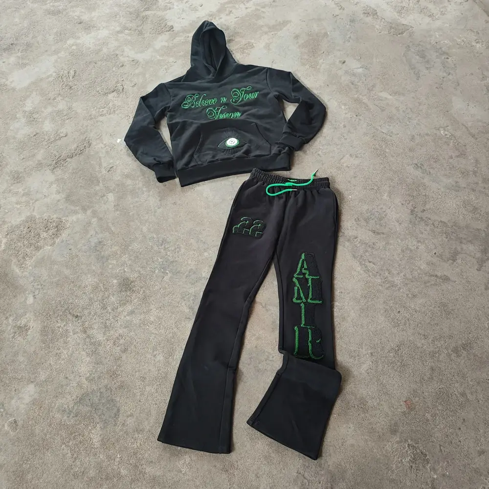 Men's Custom Flared Sweatpants Hoodie Set Streetwear Acid Wash Side Stripe Jogger Zip-up Breathable Applique Embroidery Patch