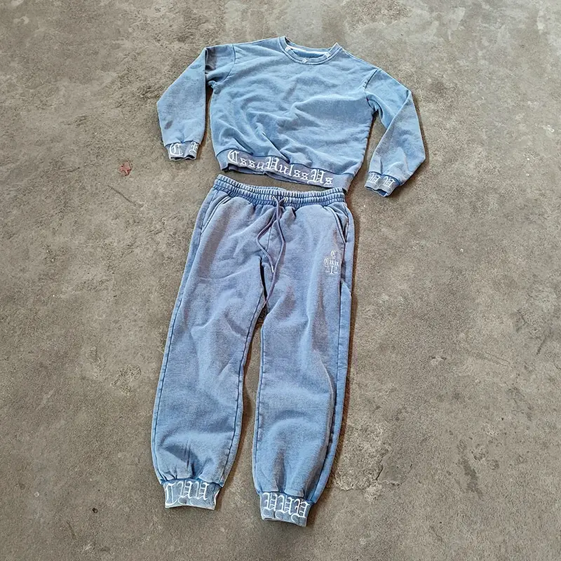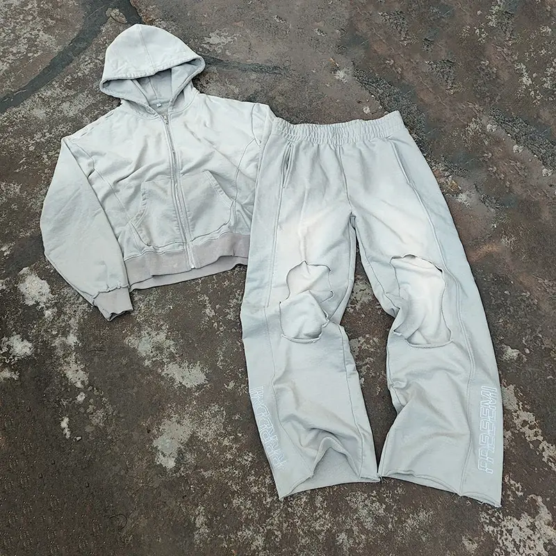 OEM Custom Men Vintage Washed Distressed Two-Piece Tracksuit Street Wear Knit Ribbed Hoodie Sweater Jogger Pants Set for Men