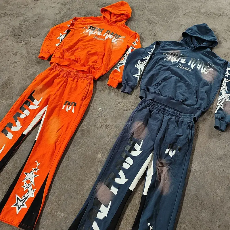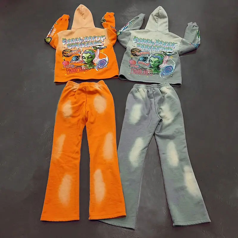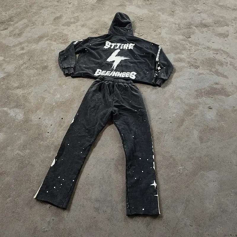 Custom Men Hoodies and Sweat Pants Set Acid Wash Tech Fleece Tracksuit Distressed Embroidery Flared Sweatpants and Hoodie Set