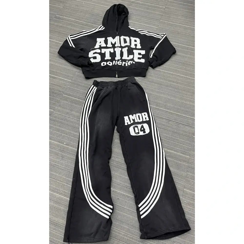 Custom Men's Outerwear Sets Cotton Baggy Cropped Boxy Side Stripe Applique Embroidery Acid Wash Zip Hoodies Sweat Pants