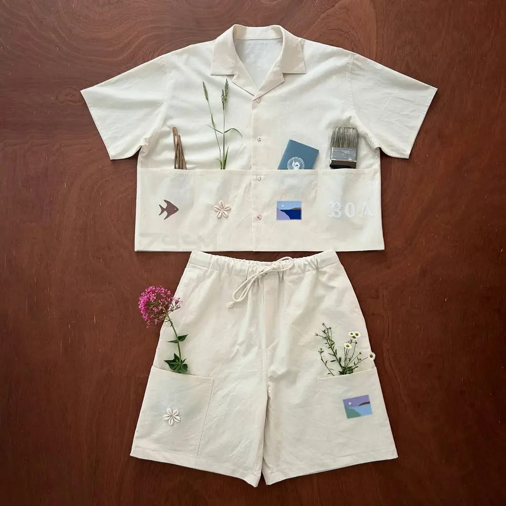 Custom Premium Linen Unisex 2 Pieces Suits Shell Decorated Long Sleeve Solid Color Linen Shirt and Wide Leg Casual Pants Set Men
