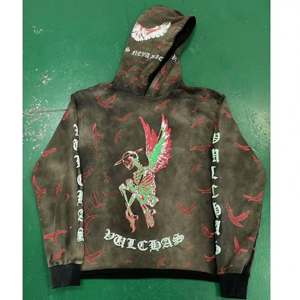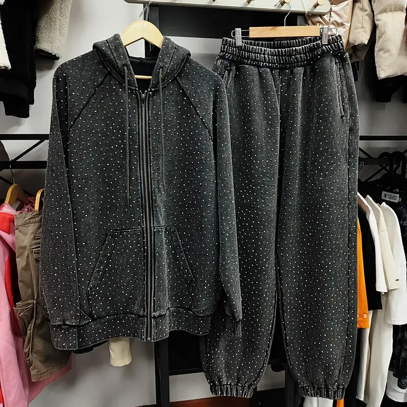 Street Style Two Piece Set Custom Print Rhinestones Jogging Faded Flared Tracksuit Stacking Sweatpants and Zip up Hoodie for Men
