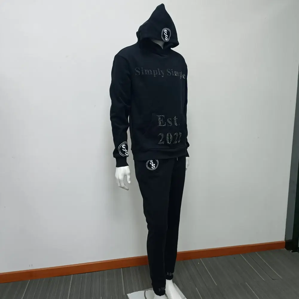 Custom Men's Winter Streetwear Oversized Sweatpants Double Zip Hoodie Set Rhinestone Patch Joggers Embroidered Sweat Suit