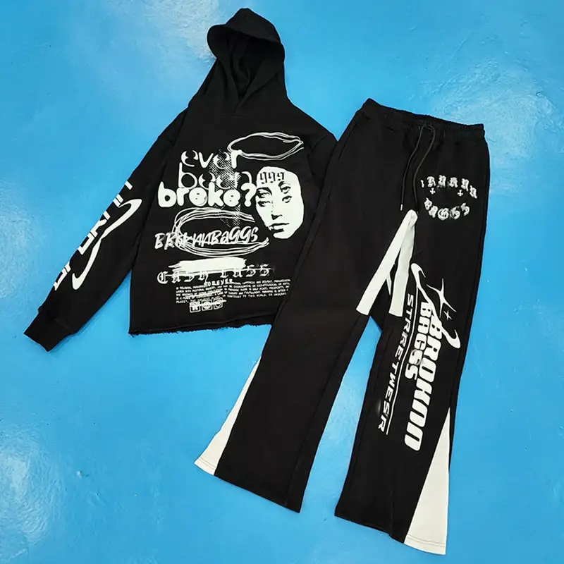 Custom Design Stacked Tracksuit Set 2 Piece Jogging Ripped Embroidery Patch Distressed Rhinestone Hoodie and Sweatpants Suit