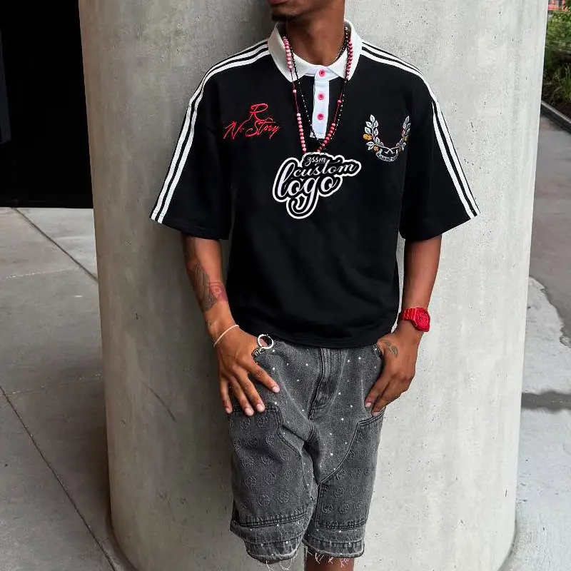 Custom Summer Heavyweight Cotton Sport Short Sleeve t Shirts Cropped Knitted Striped Boxy Embroidery Polo Shirts for Men