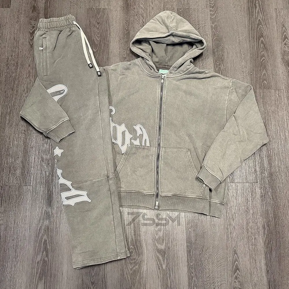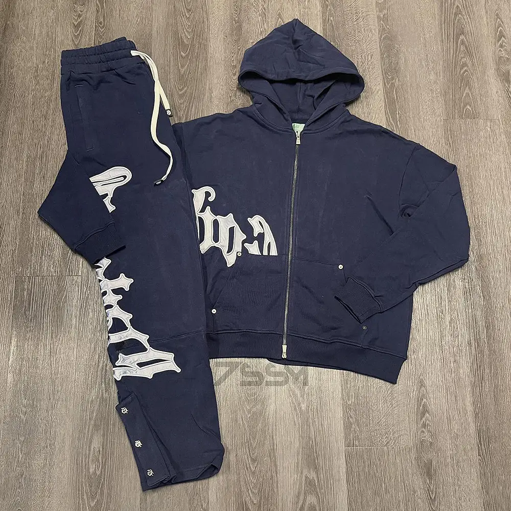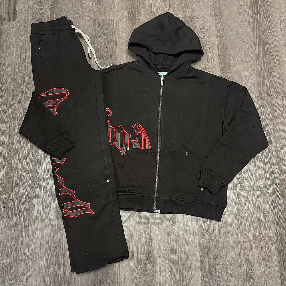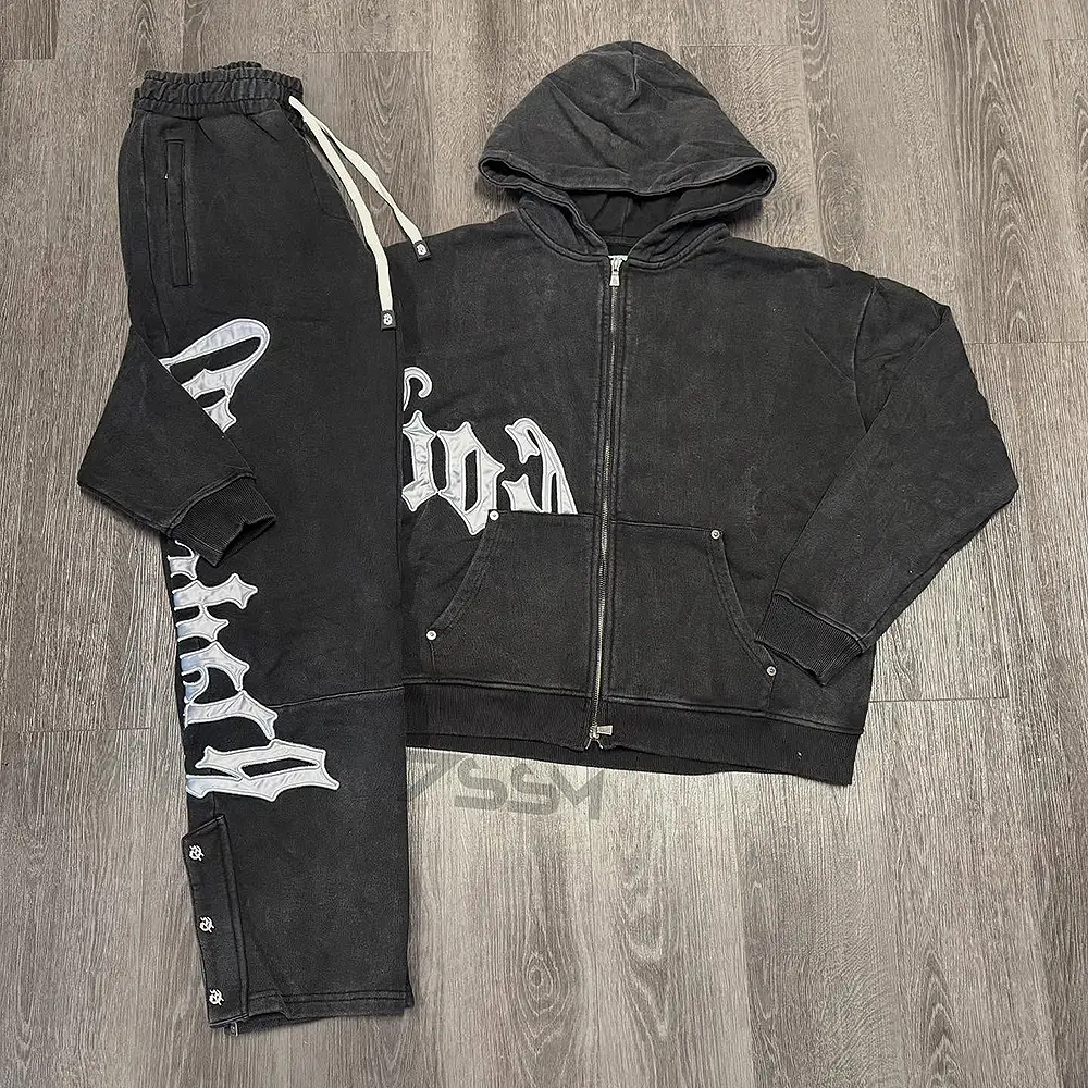 Manufacturer Custom 2 Piece Streetwear Vintage Jogging Zip up Tracksuit Button Patch Embroidery Sweatpants and Hoodie Set
