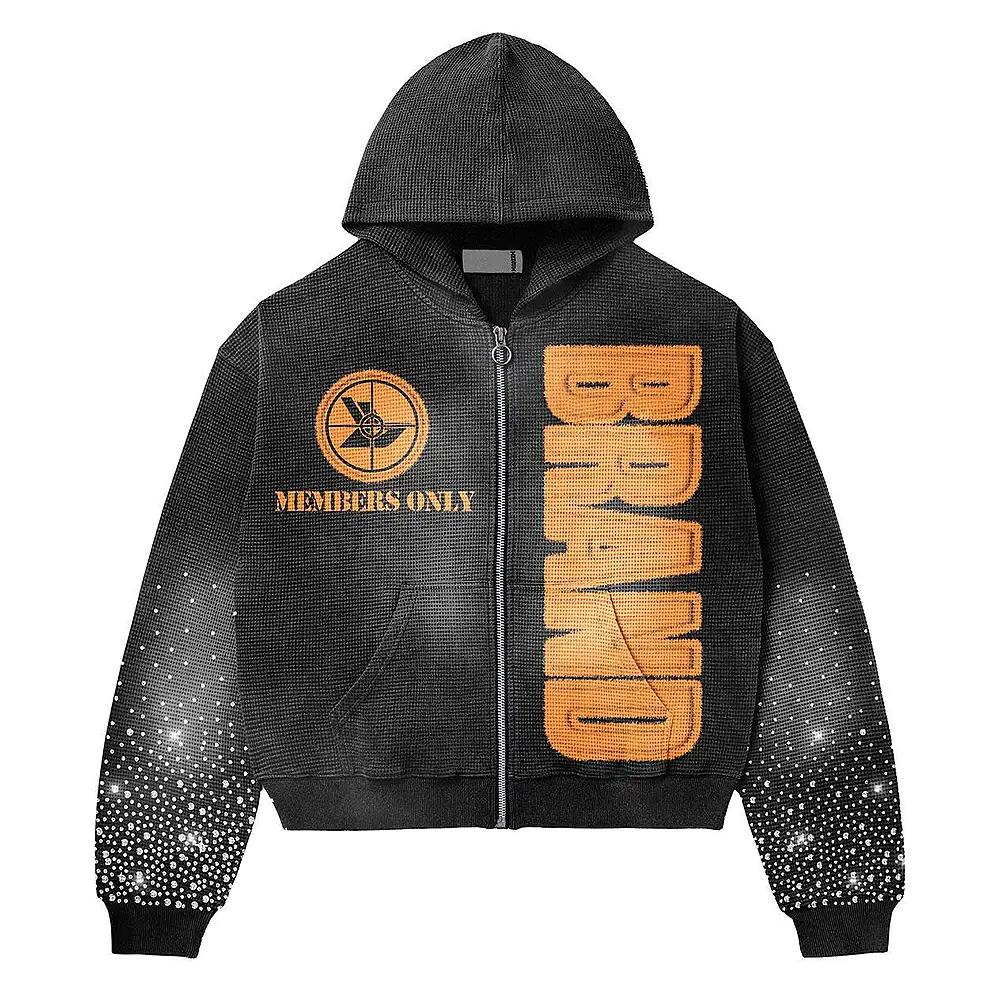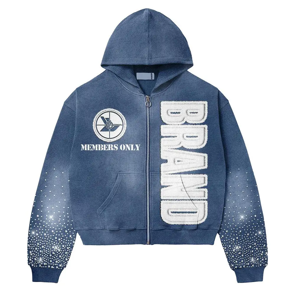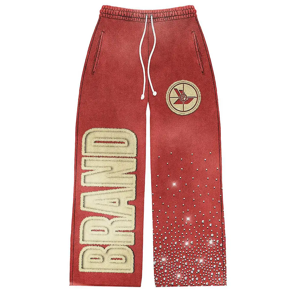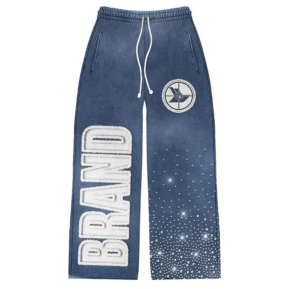 Custom Design Stacked Tracksuit Set 2 Piece Jogging Ripped Embroidery Patch Distressed Rhinestone Hoodie and Sweatpants Suit