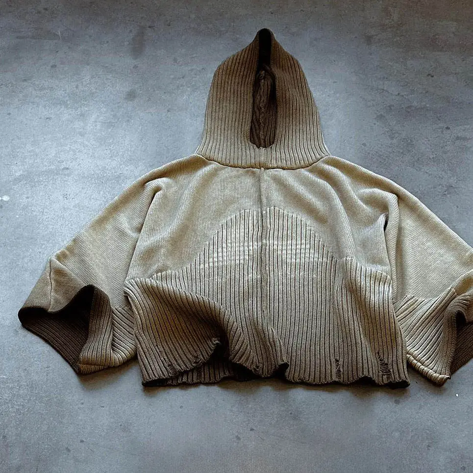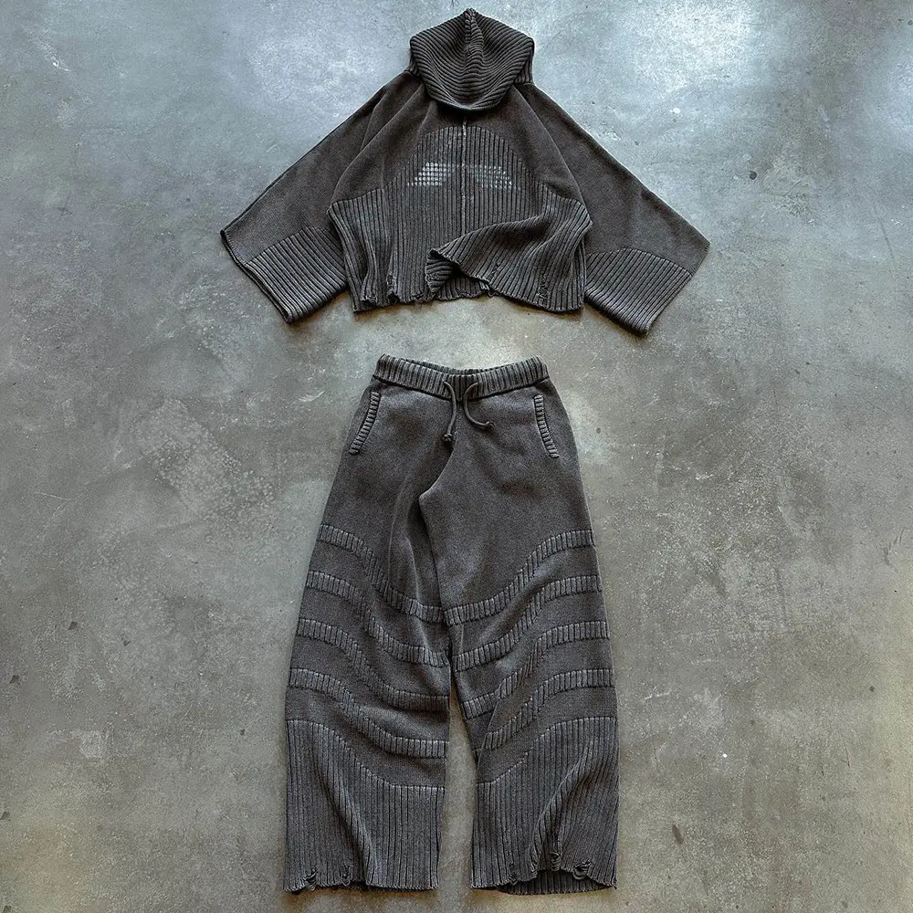 OEM Custom Men Vintage Washed Distressed Two-Piece Tracksuit Street Wear Knit Ribbed Hoodie Sweater Jogger Pants Set for Men