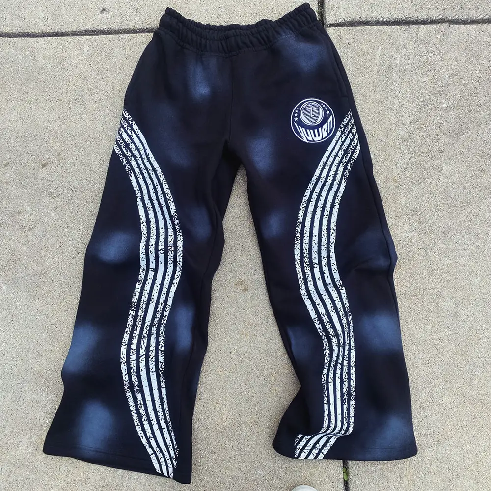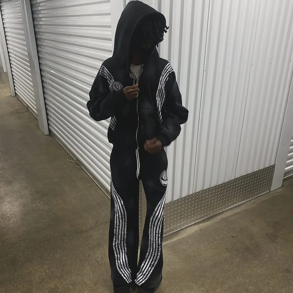 Custom Men's Outerwear Sets Cotton Baggy Cropped Boxy Side Stripe Applique Embroidery Acid Wash Zip Hoodies Sweat Pants