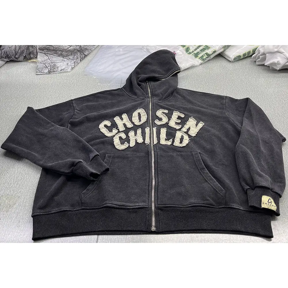 distressedappliqued embroidery hoodies zip up hoodies